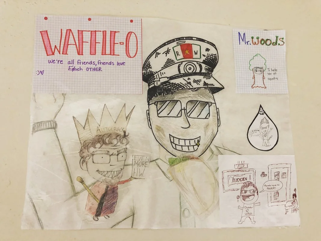In the center is Communist Dictator Mr. Woods eating a taco. (My love of which my students in Georgia found strange. The concept of a breakfast taco left them flabbergasted.) This originally came from a giant banner that was hung in the hallway outside of my classroom that read “Role of Citizens: Obey Mr. Woods.” It was all my students’ decision, I promise.